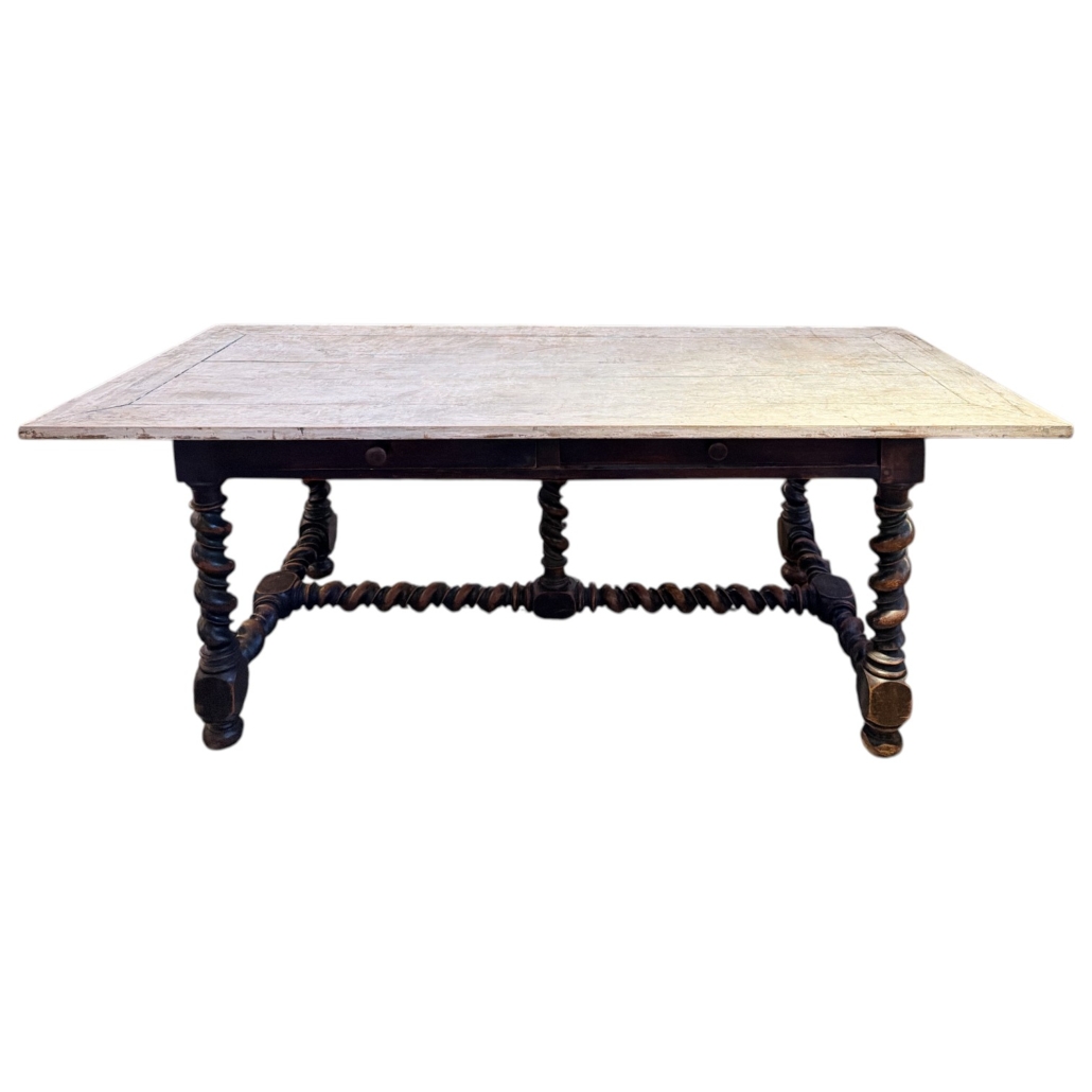 19th C French Louis XIII Barley Twist Table With Painted Top and Two Drawers