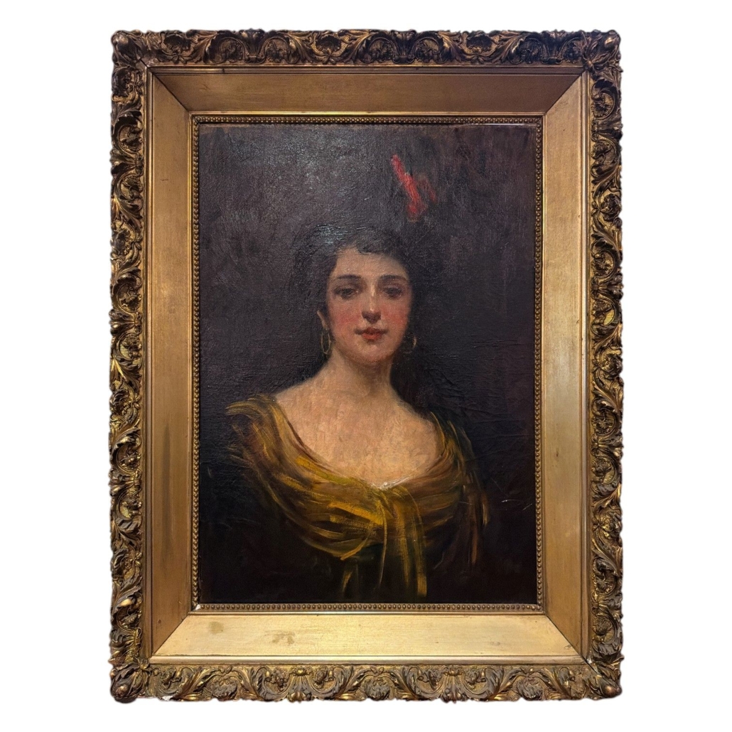 Oil Painting of “Woman with Red Feather,” Late 19th C, Original Gilt Wood Frame