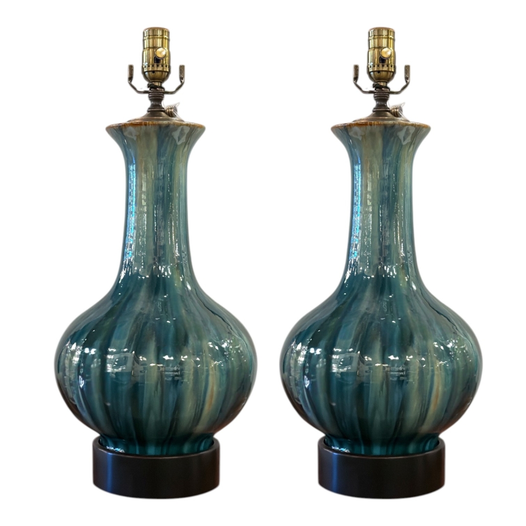 Pair of Blue and Green Gourd Vases on Custom Bases as Lamps