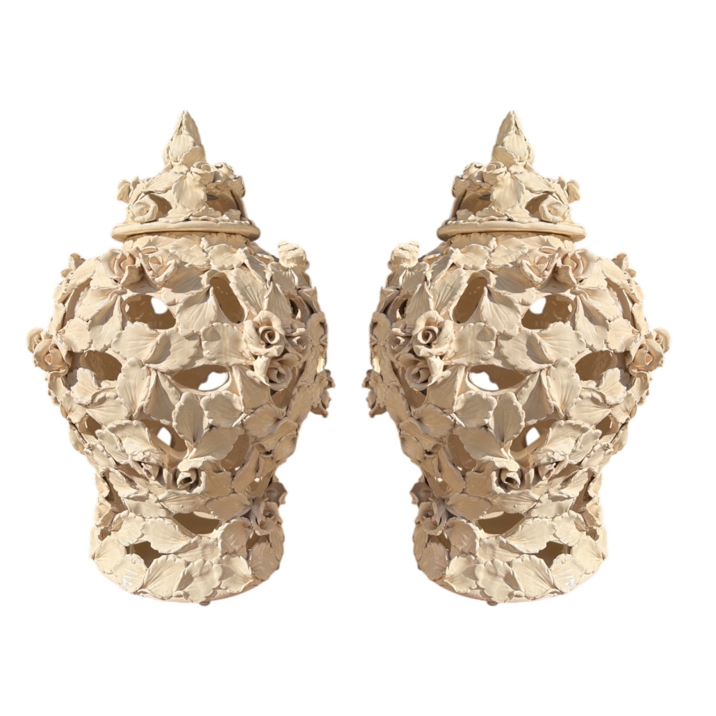 You are here: Home1 / Antiques2 / Decorative3 / Accessories4 / Pair of Pottery Urns with Floral and Lattice Details