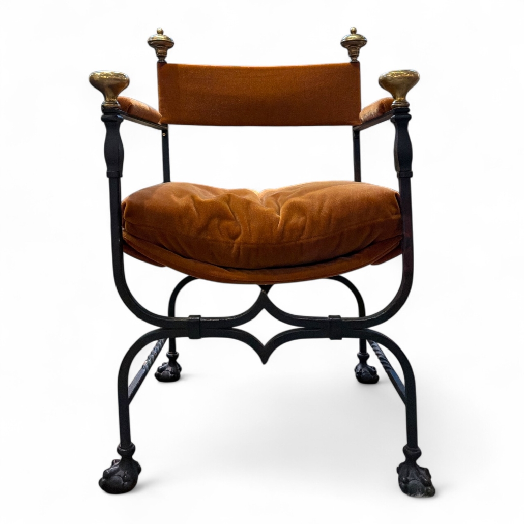You are here: Home1 / Antiques2 / Seating3 / Single Chairs4 / Vintage Iron and Brass Savonarola Chair with Cinnamon Mohair Upholster...