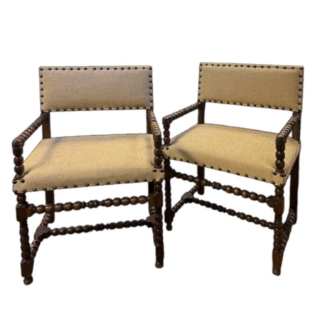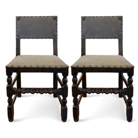 Pair of Jacobean Chairs with Original Leather & Decorative Brass Tacks