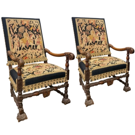 Pair of Louis XIII Style Walnut Armchairs with Needlepoint Tapestry Upholstery